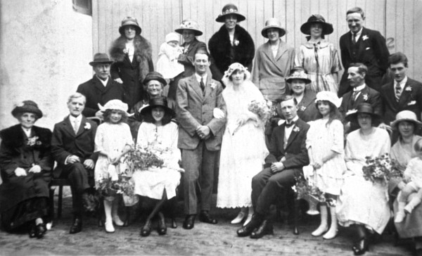 Front row l-r Mary Francis Arrow, Walter Francis, Betty Arrow, Elsie Arrow,  Stephen (Best man), ?, Em Hedger, Win Hedger w/Ron.